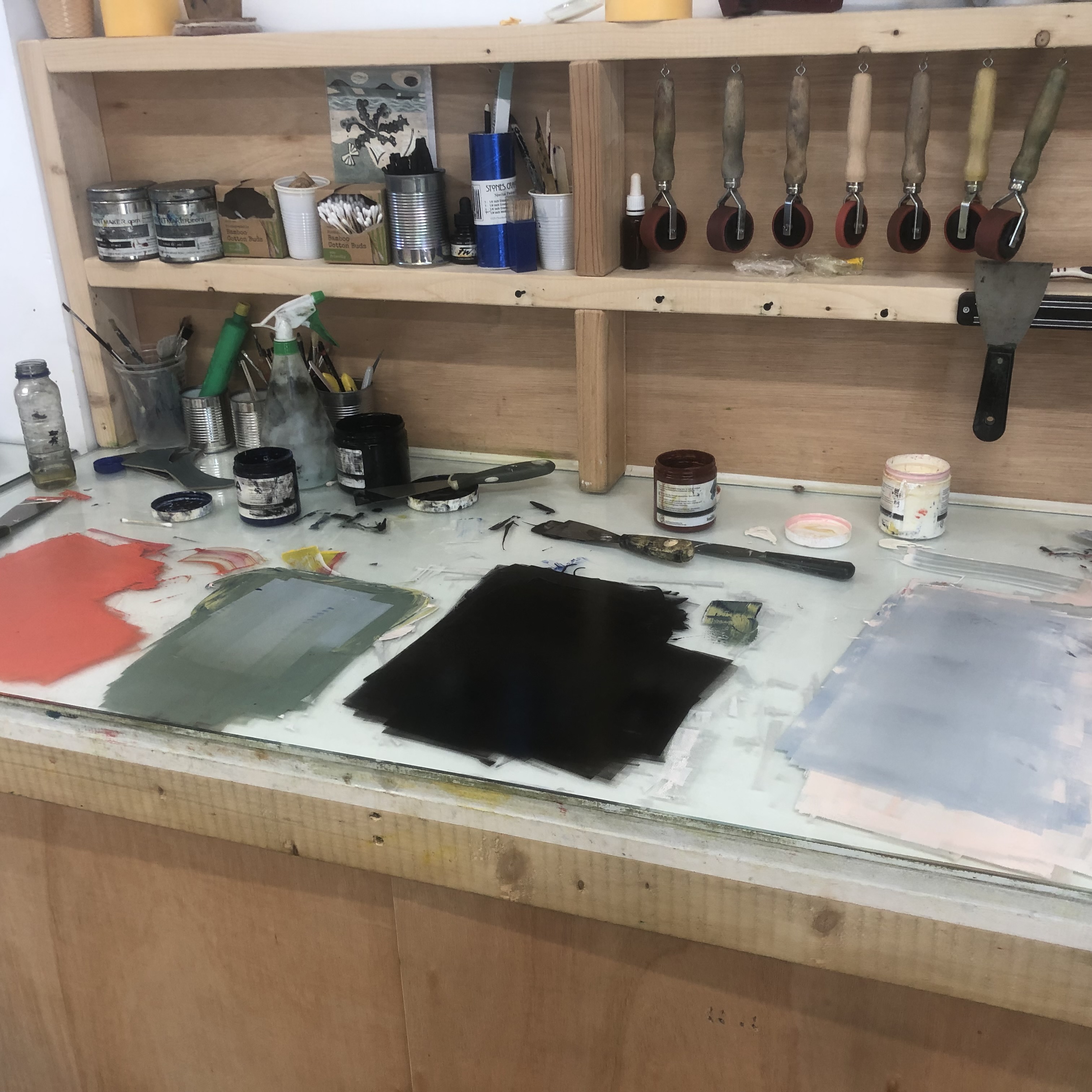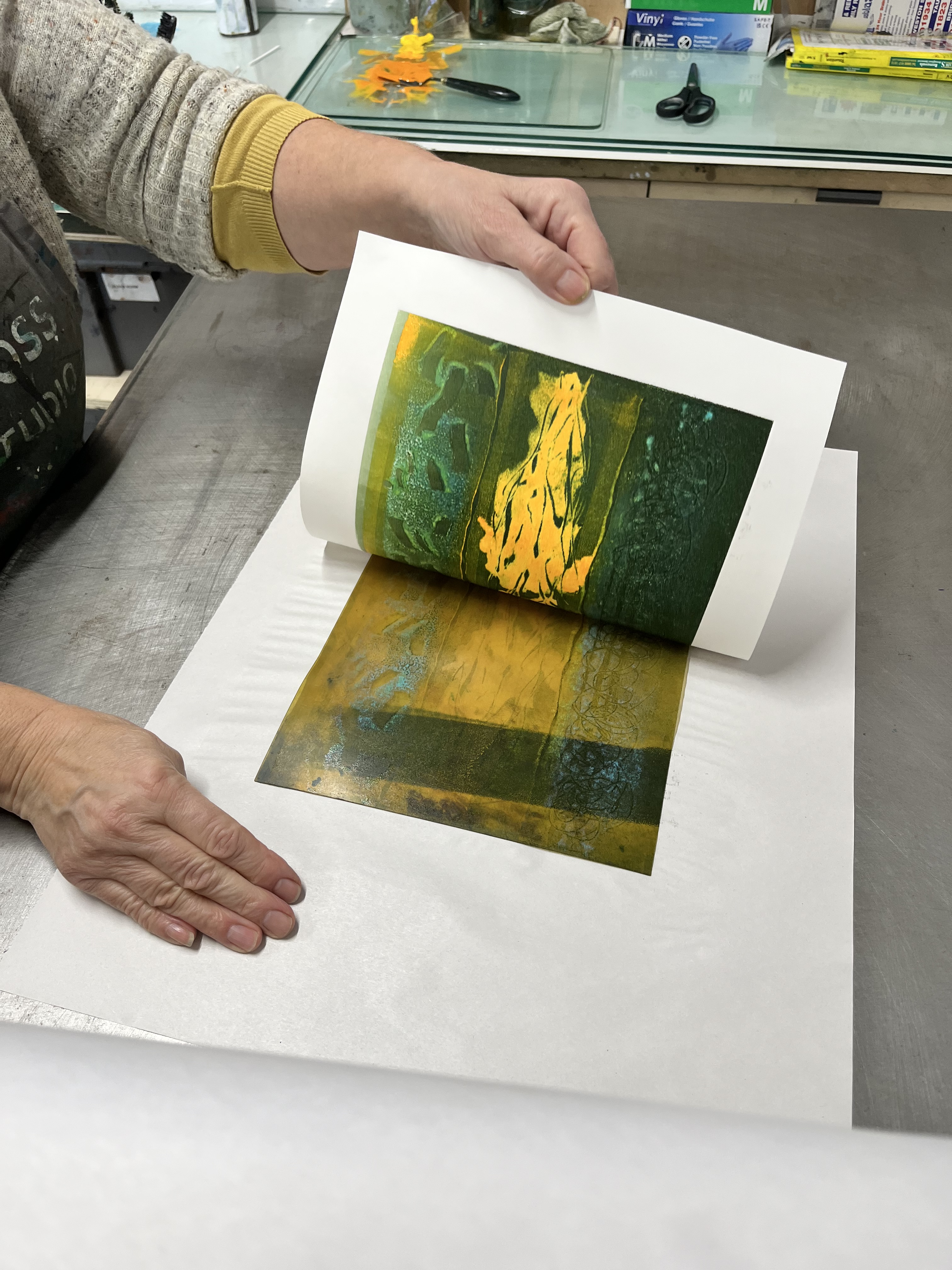 On Day 1, participants will learn how to construct and seal a simple collagraph plate, how to ink up, wipe and then print it using the etching press.
