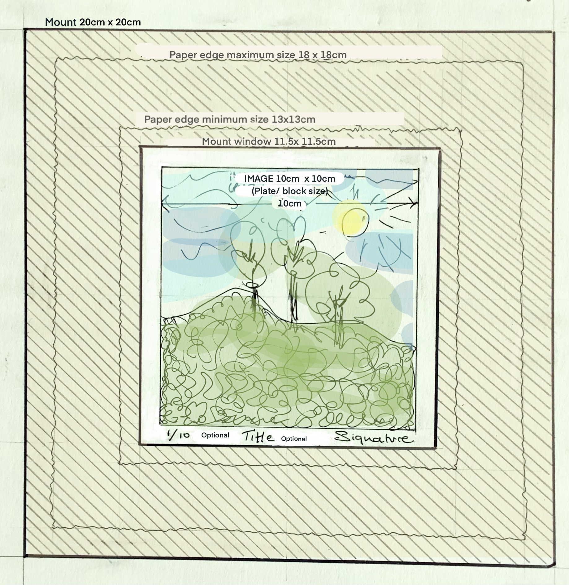 All work will be displayed unframed, in uniform, soft white window mounts sourced by the studio. The mounts will measure 20 x 20cm (to fit standard-sized, readily available picture frames), with an aperture opening of 11.5 x 11.5 cm. Prints to be exhibited should be 10cm x 10cm or less, supplied on paper 13 x 13cm and no larger than 18cm x 18cm, suitable for mounting within the above parameters. This allows a narrow margin for signature and edition numbering, if applicable, to show within the window. Please see the image below for guidance.